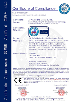 我公司设备已通过IOS 9001认证和CE认证等,具有行业专利二十余项。我们是非常专业的数字化感应加热设备生产公司,每一台设备的出厂都会经过专业的工程师的全方位检测,并会跟踪至客户应用现场,进行现场技术调试和工艺参数交接,确保客户在使用过程中的技术和工艺参数,为客户的全生产周期提供保障。